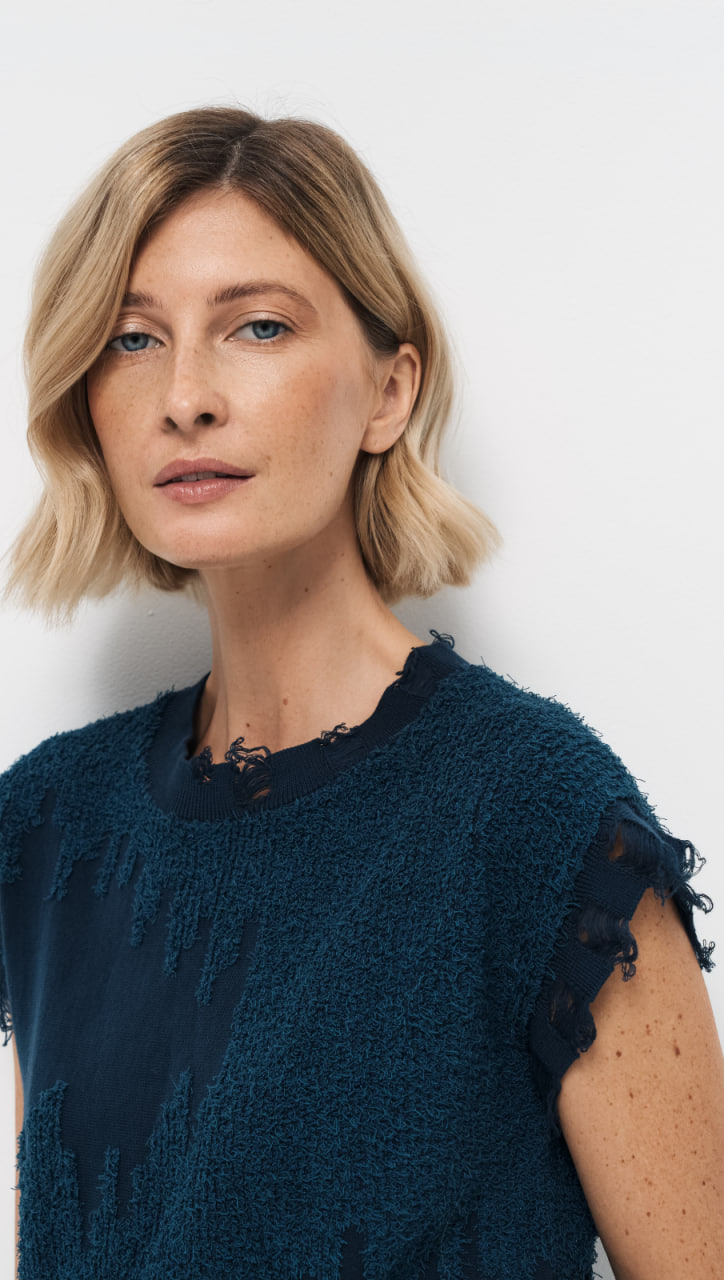 Жилет свободного прямого силуэта изготовлен из качественной смесовой хлопковой пряжи, обеспечивающей прочность и долговечность изделия. Жилет дополнен гранжевыми деталями, имитирующими распущенные протяжки по пройме и низу изделия, что придаёт базовой форме почти художественный вид. Цвет «синяя глубина» отлично сочетается с различными оттенками в комплектах.