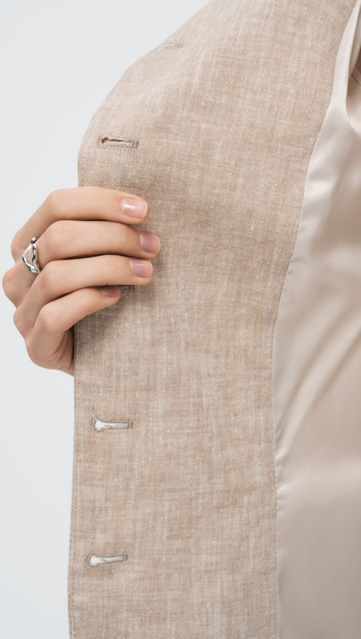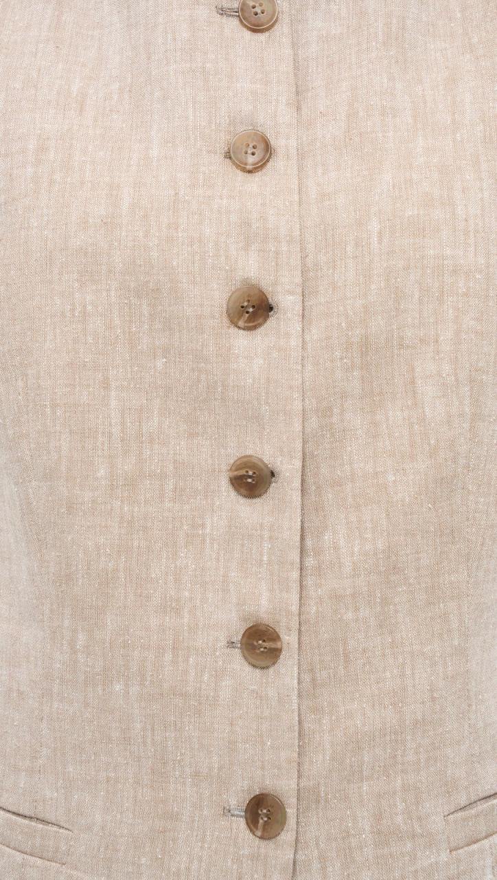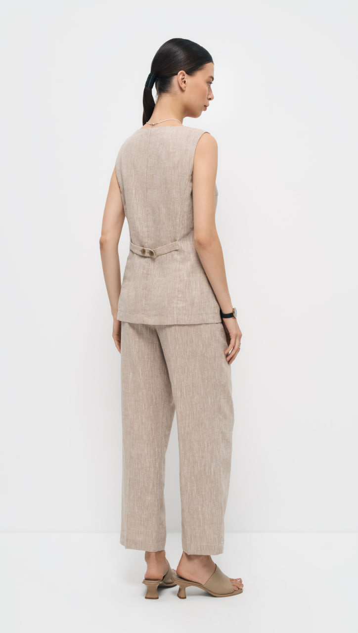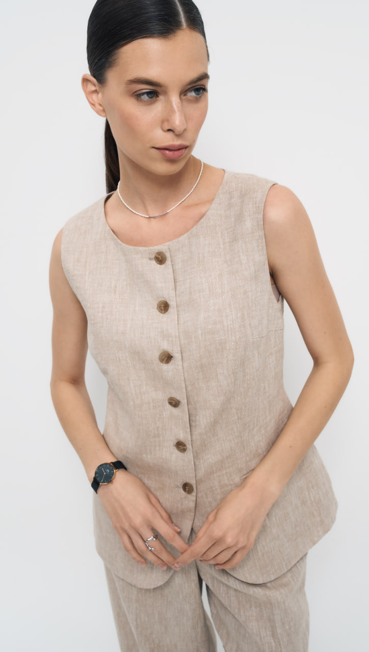 Жилет изготовлен из высококачественной ткани, сочетающей в себе премиальный лён и тенсел с эффектом меланжевой нити. Это обеспечивает изделию не только роскошный внешний вид, но и долговечность, а также комфорт при носке. Изысканный оттенок «солёная карамель» добавит изысканности и шарма в ваш образ.