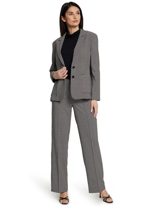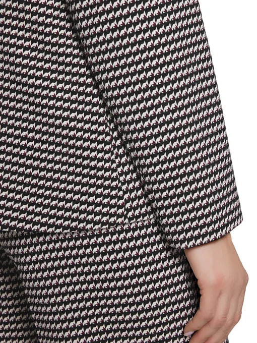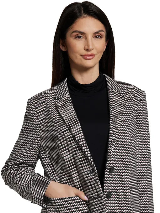 Этот пиджак с изысканным узором "гусиная лапка" в черно-белых тонах идеально сочетает классику и современность. Элегантный принт придает образу утонченность и шарм, а монохромная палитра делает его универсальным дополнением любого гардероба. Строгий силуэт и безупречный крой подчеркивают индивидуальность владельца.